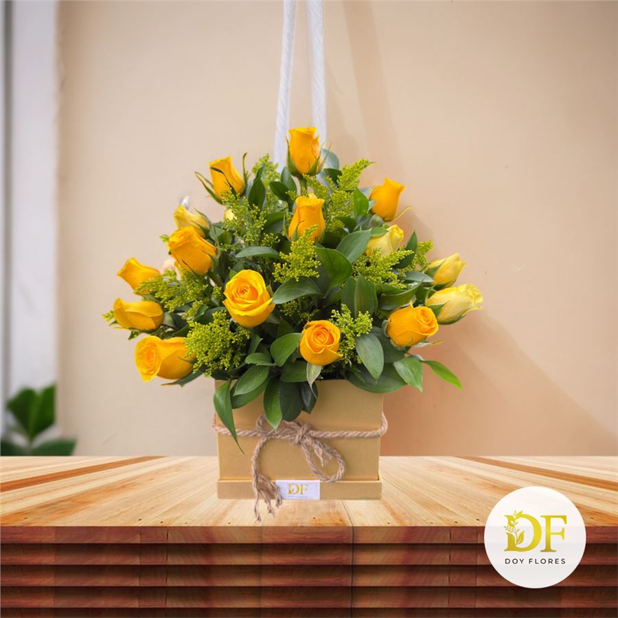 Un arreglo que irradia optimismo y cariño. Con 24 rosas símbolo de alegría y amistad, acompañadas de aster, una flor que aporta frescura y luminosidad, este diseño es perfecto para celebrar la vida, agradecer o alegrar el día de alguien especial con un gesto lleno de color y buena energía