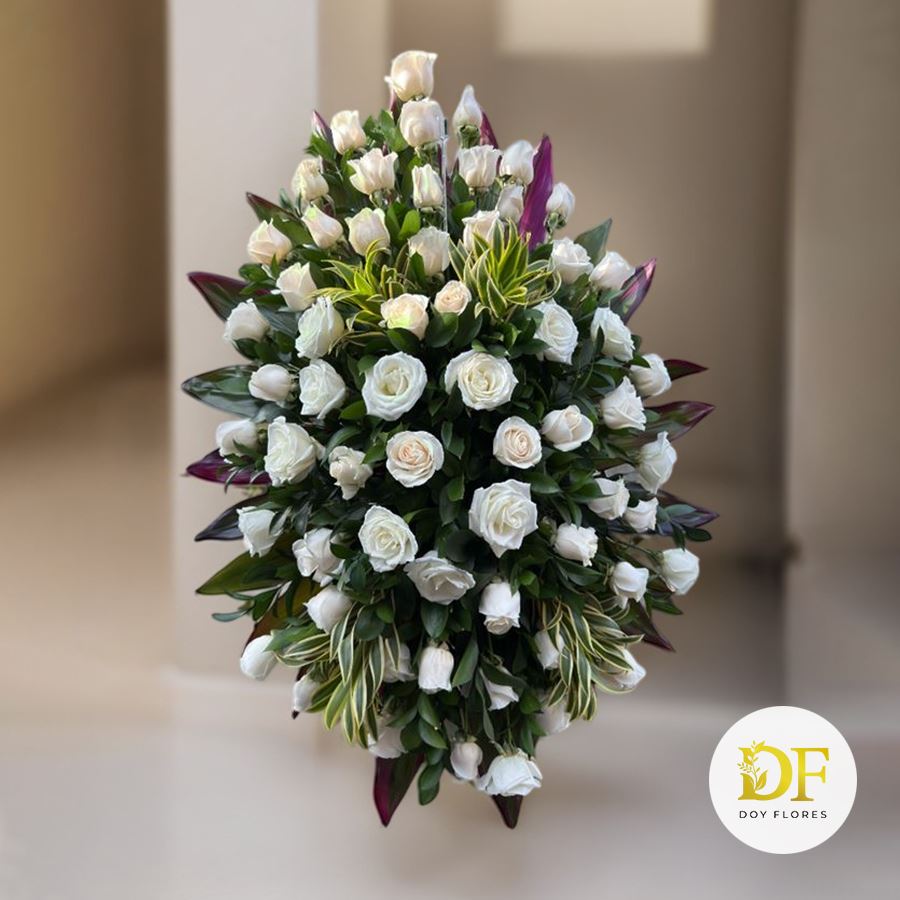 Un gesto lleno de significado y delicadeza. Este arreglo presenta 48 rosas que representan pureza y respeto, cuidadosamente dispuestas para transmitir emociones sinceras. Ideal para expresar cariño, acompañar momentos especiales o rendir un homenaje con elegancia y sensibilidad.