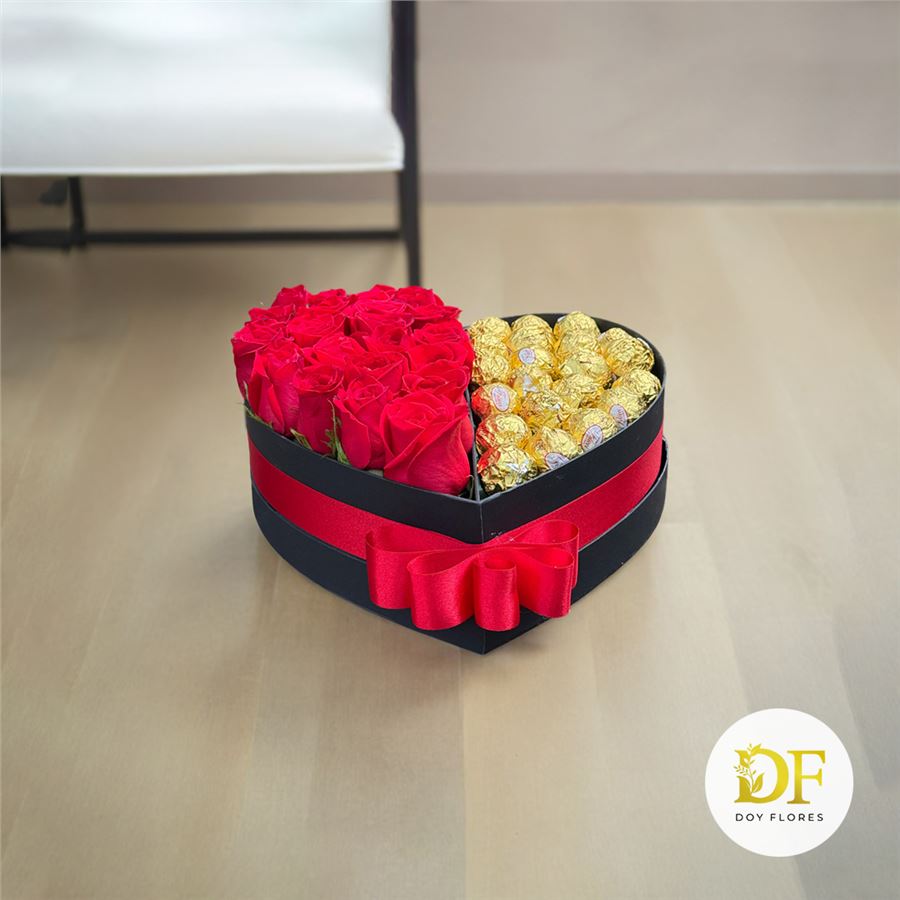 Una fusión perfecta entre dulzura y sentimiento. Este hermoso arreglo incluye 21 rosas frescas, símbolo de amor y delicadeza, acompañadas por 21 chocolates Feliccy que añaden un toque dulce y especial. Todo presentado en una elegante caja con forma de corazón, ideal para sorprender con estilo y expresar lo que las palabras no pueden decir.