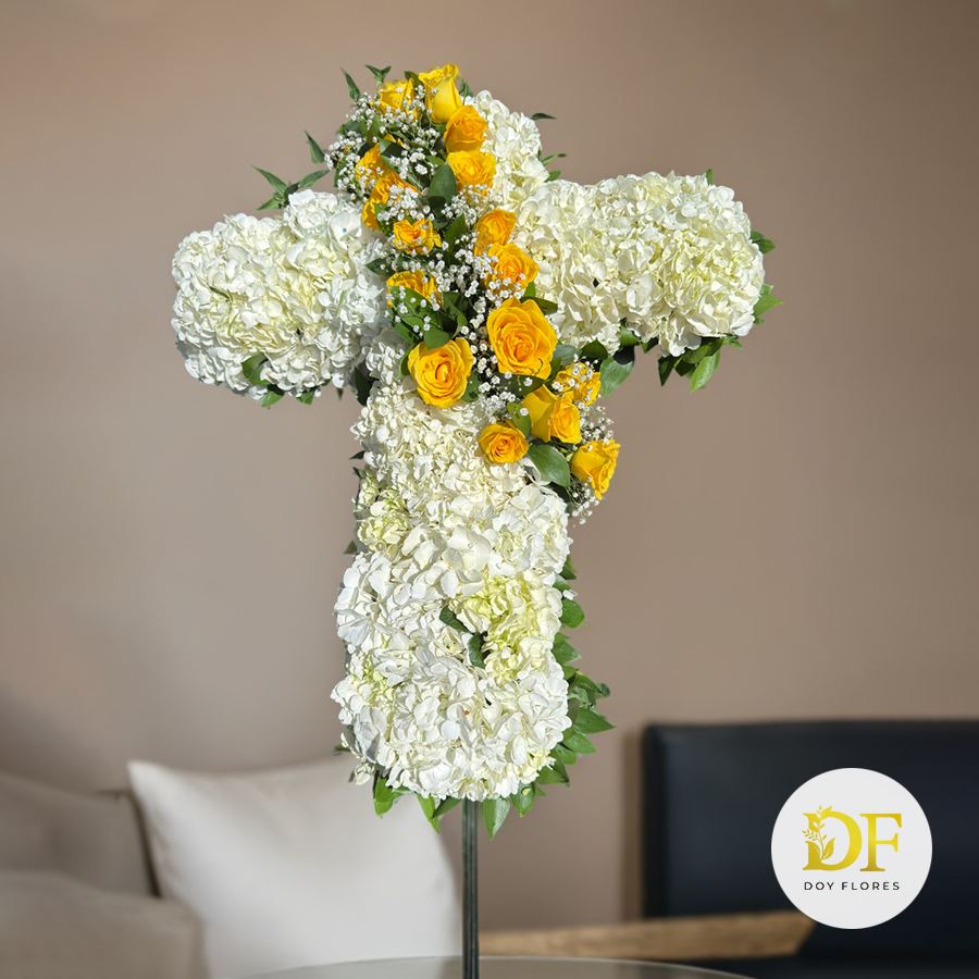 Diseño en cruz floral elaborado sobre base de madera artesanal, con 36 hortensias, 24 rosas, follaje rusco y un toque delicado de gypsophila (1 paquete). Un arreglo solemne, elegante y lleno de luz, ideal para expresar paz, despedida y acompañamiento.